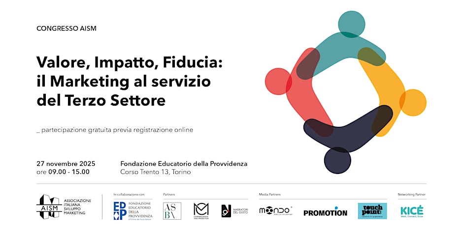 L’evento dal titolo “Valore, Impatto, Fiducia: il Marketing al servizio del Terzo Settore” si terrà giovedì 27 novembre 2025, dalle ore 09:00 alle 15:00, presso la Fondazione Educatorio della Provvidenza ETS, in Corso Trento, 13 a Torino.